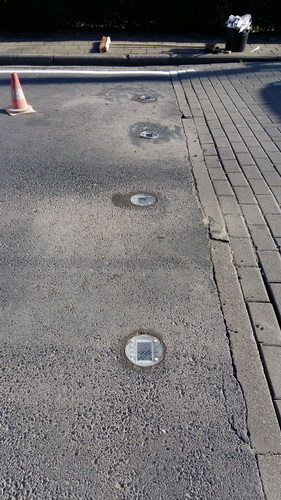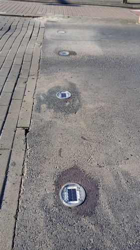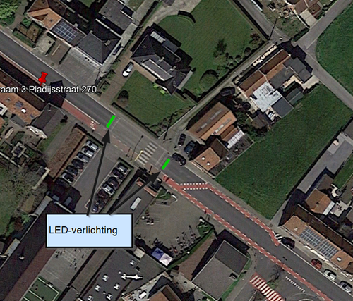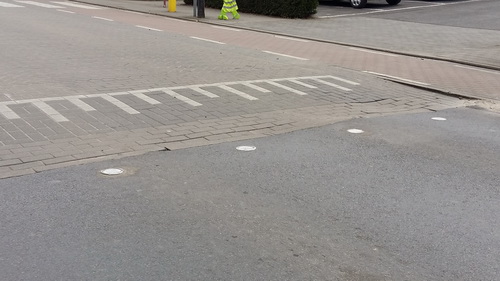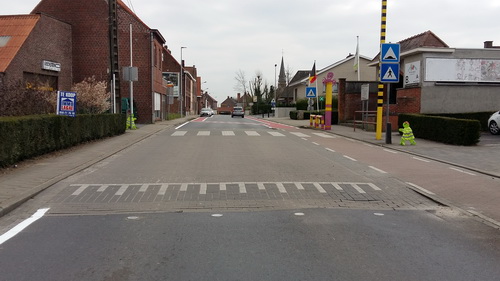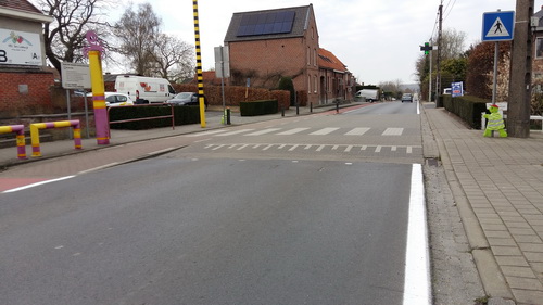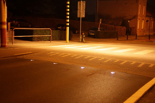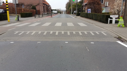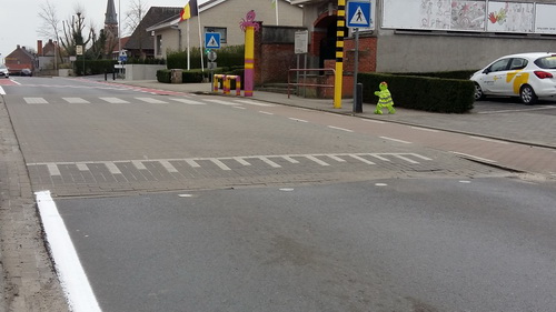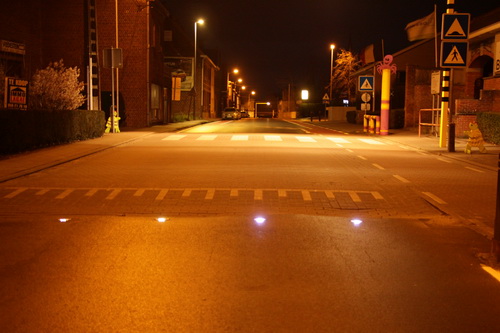 Met dank aan de gemeente Deerlijk kon een test uitgevoerd worden aan een zebrapad op wegdekverhoging aan een school. Daar er geen volle witte streep aanwezig is op de rijbaan, werd gekozen voor verlichting over de ganse breedte van het wegdek langs beide kanten van de wegdekverhoging. Vanuit de gemeente had men de voorkeur om een hybride oplossing van flashing en steady te gebruiken. Op het rechter rijvak, de aanrij richting, verkoos men een flashing type en op het linker rijvak dan steady. Voor ILLUXYS een opportuniteit om ons nieuw produkt, de SYNCHRO flashing op zonne-energie, te installeren. We proberen altijd in een bebouwde kom, en zeker in een zone 30, een rustig lichtpatroon te hebben. We verkiezen daarvoor altijd graag een Steady type. Door nu ook gebruik te maken van SYNCHRO verlichtingselementen verstoren we niet echt dit rustig karakter. Indien we allemaal flashing (non-synchro) zouden installeren, dan verkrijgen we eerder een storend effect.