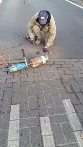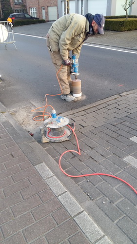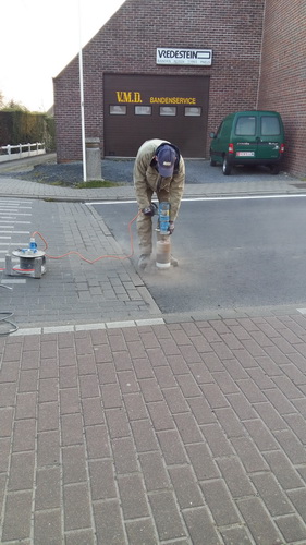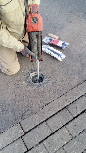 Om onze onderaannemer vertrouwd te laten worden met onze produkten voor installatie én om een beste "lijm" uit te testen voor een snelle montage, werd gezocht naar een test locatie. Het gebruikte produkt was HILTI 2 componenten injectie mortel HIT-HY 170. Het voordeel is dat men geen voormenging moet doen. Droogtijd = 20 minuten.